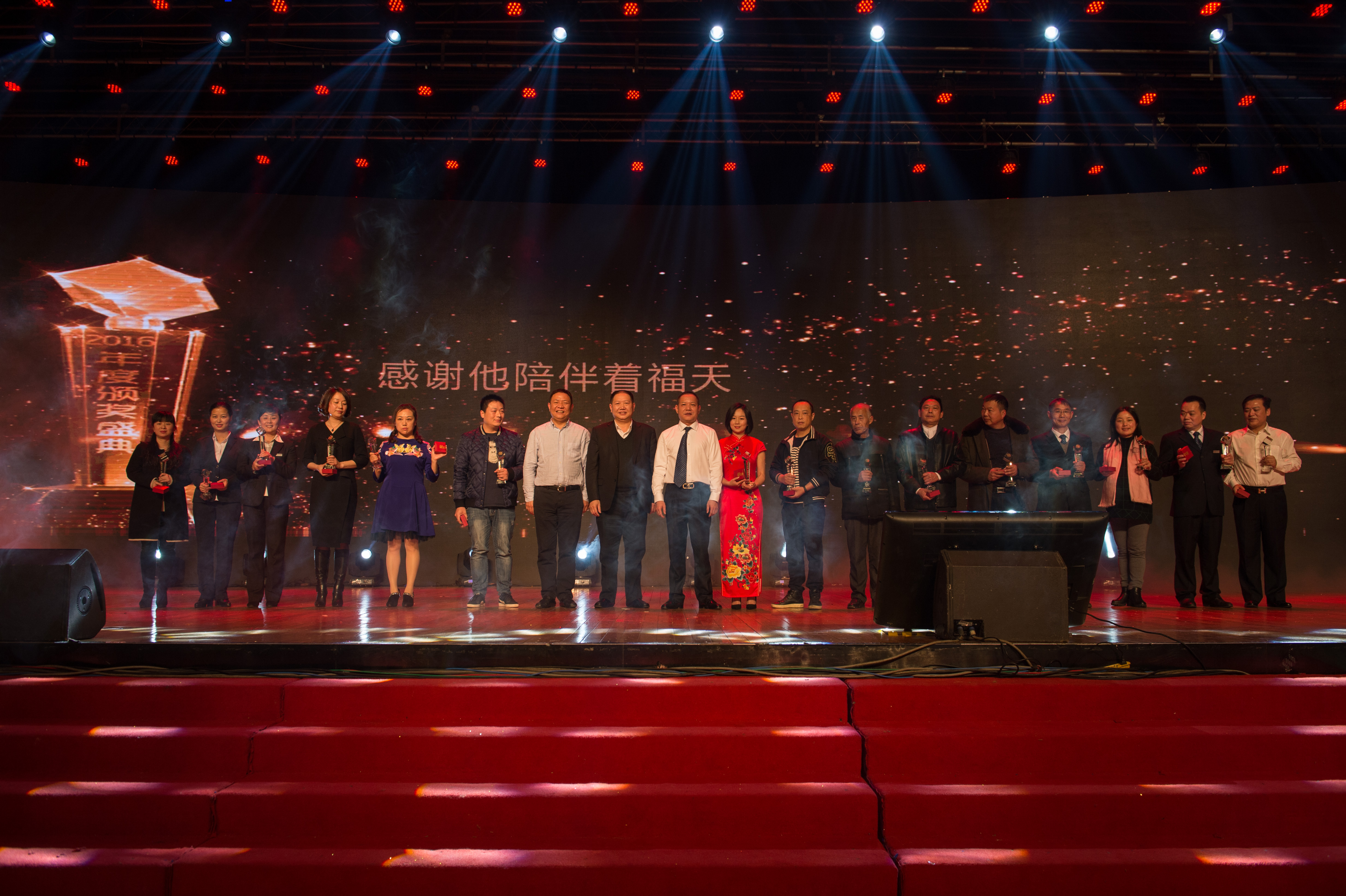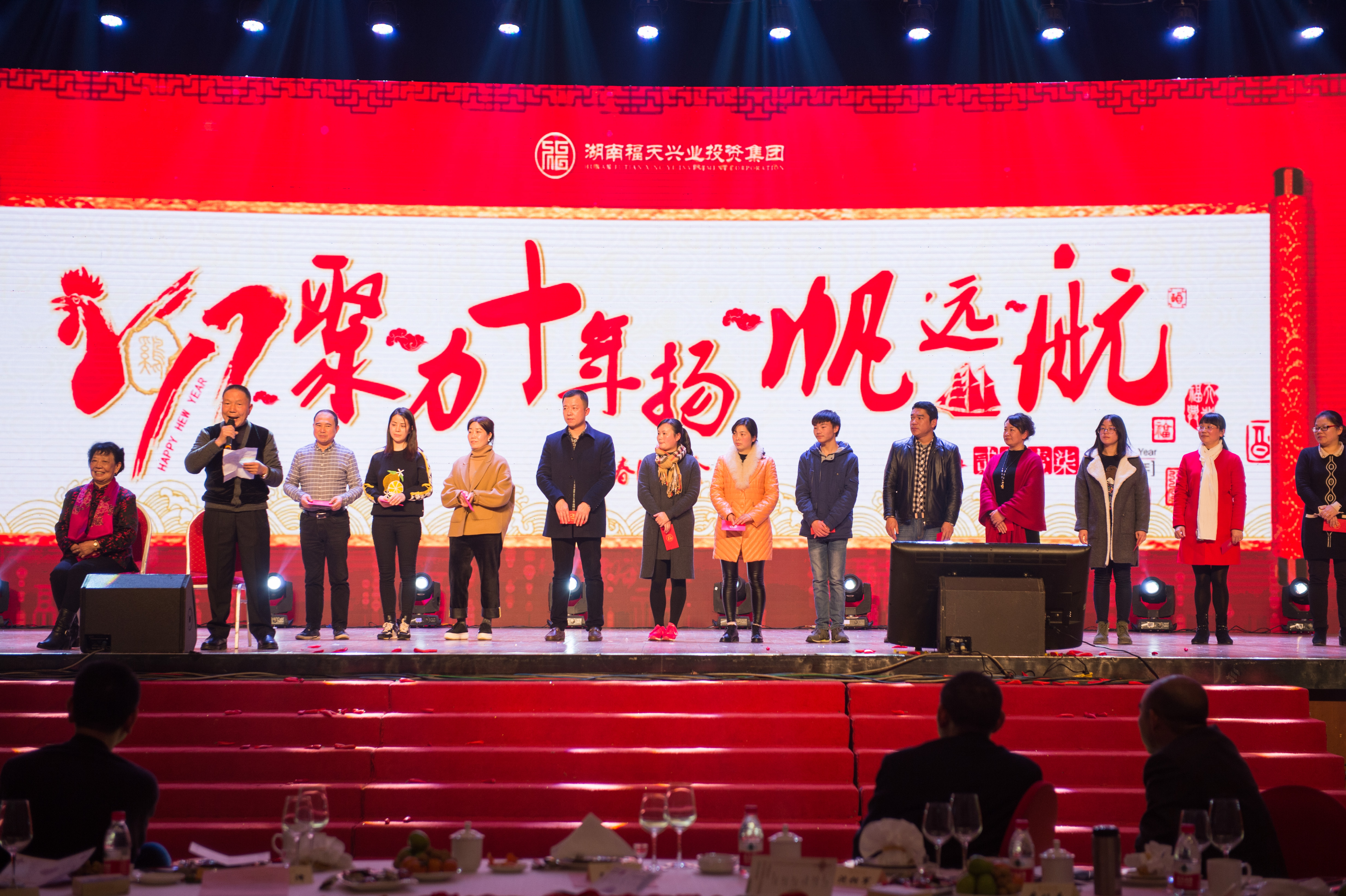 “聚力十年•扬帆远航”本次盛典不仅是辞旧迎新之会,更是福天集团诞生10周年庆典。团拜会上,特别策划的“风雨同舟,相伴十年”,胡总三兄弟为十年老员工上台颁奖,感谢他们的默默奉献,一路陪伴。特别策划的“背后的故事”环节,邀请了集团高管家属们上台,胡满嗲、胡满娭毑亲自为他们颁奖,胡满嗲倾情发言并给大家带来新年的问候,将整个会场推向高潮。美好的时光总是匆匆而过,伴随着激动人心的幸运大抽奖,大会最终完美落幕。
