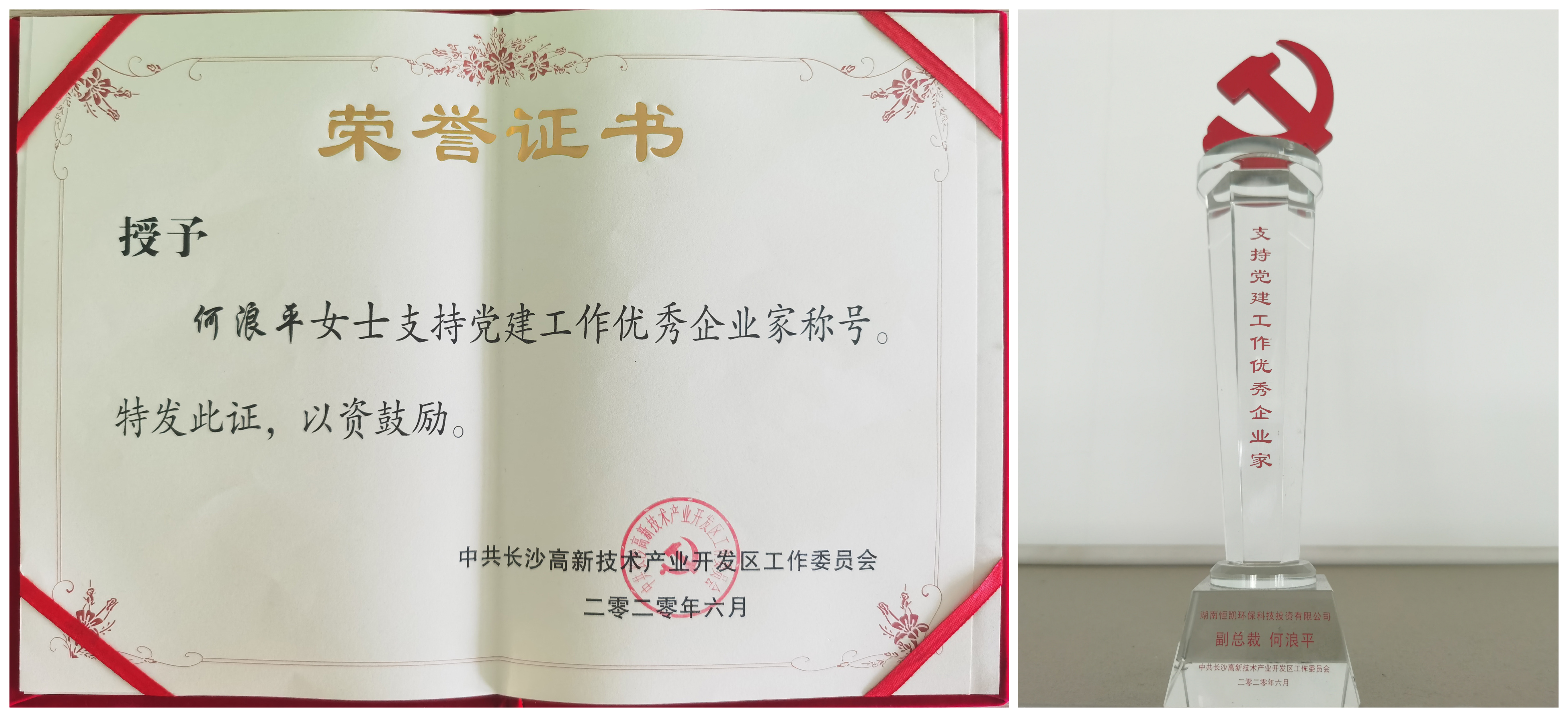 6月28日,在中共长沙高新技术产业开发区工作委员会举行的庆祝建党九十九周年暨“七一”表彰大会上,恒凯环保党委副书记、副总裁何浪平同志获评“支持党建工作优秀企业家”称号。